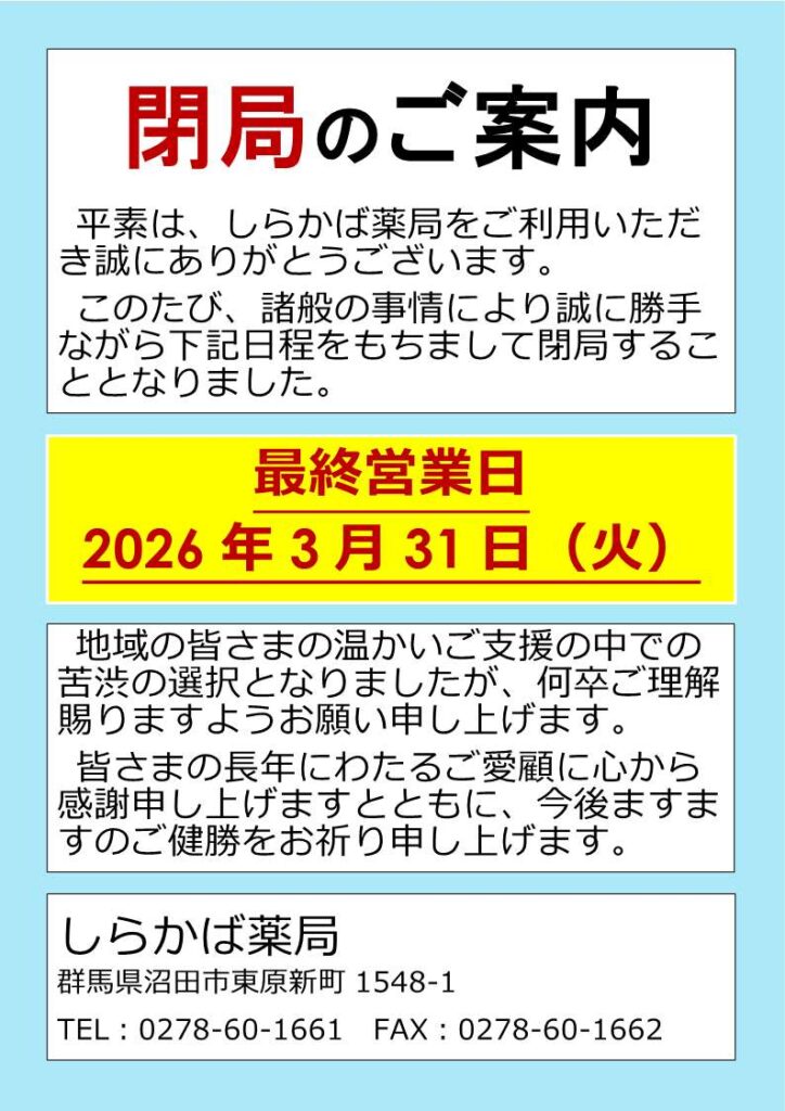 平素は、しらかば薬局をご利用いただき誠にありがとうございます。
